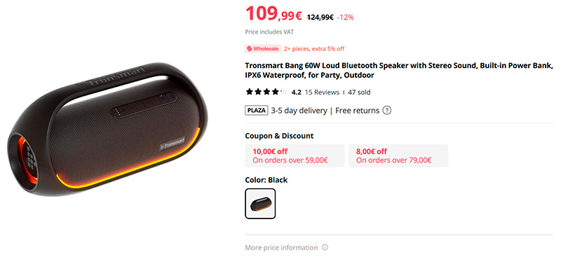 Очень мощная беспроводная колонка Tronsmart Bang 60W. Такой мощности хватит на то, чтобы отлично "раскачать" не только большое помещение, но и устроить дискотеку на открытом воздухе для всей компании. В ней импользуется несколько запатентованных технологий улучшения звука, включая SoundPulse Audio. От одного заряда колонка работает 15 часов и может использоваться в качестве внешнего аккумулятора. Имеет RGB-подсветку, реагирующую на воспроизводимую музыку. Переносная, влагозащищенная, поддерживает несколько голосовых ассистентов, может дополнительно настраиваться через приложение.