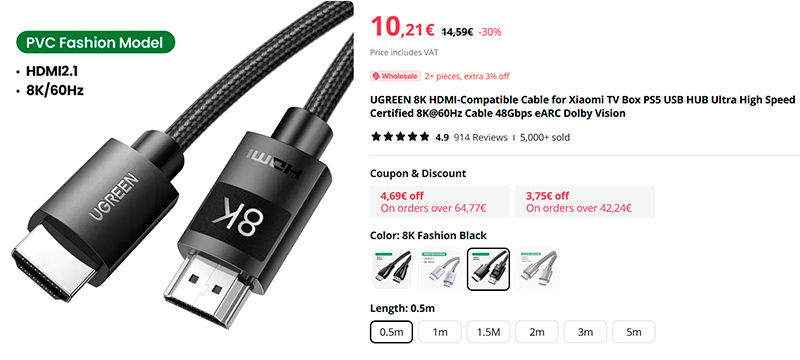 Качественный HDMI 2.1 кабель от Ugreen с поддержкой 8K@60Гц. Размеры от 0,5 м до 3 м.