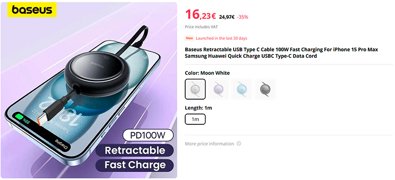 Автоматически сматываемые кабели - штука удобная, особенно когда они продвинутые и поддерживают мощность до 100 Вт, то есть их можно использовать и для быстрой зарядки, и для питания ноутбуков. Вот вариант от Baseus - метровый, автоматически сматываемый кабель Type-C. Возьму себе парочку - надоели постоянно лежащие кабели на столе.