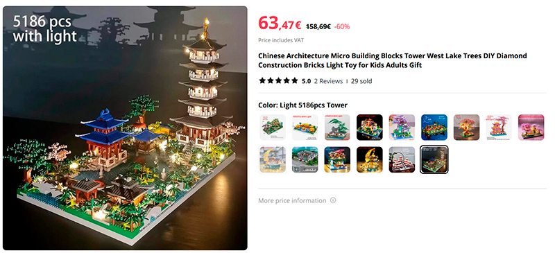 Для любителей конструкторов типа LEGO - большой выбор конструкторов различных строений в китайском стиле. От 1000 до более 5000 деталей. Некоторые сложные конструкторы имеют эффектную подсветку.