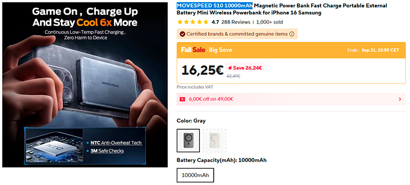 Выбирал себе для предстоящей поездки максимально тонкий и недорогой аккумулятор с беспроводной зарядкой MagSafe - надоело возиться с кабелями, хочется просто пришлепнуть к смартфону и пускай заряжается. Мне снимать предстоит много, поэтому искал аккумулятор на 10000 мАч (на 5000 мАч у меня есть). В итоге среди всяких разных вариантов победил вот этот аккумулятор от Movespeed: мне нравится этот производитель, у меня уже куча их гаджетов, и они ни разу не разочаровали. Их аккумулятор самый тонкий и реально дешевый. (В соответствии заявленной емкости я не сомневаюсь, много раз измерял.) Мощность зарядки у него - 20 Вт, что вполне нормально для беспроводной зарядки. Для сравнения, аналогичный аккумулятор от Baseus - 50 евро. И я не уверен, что он хоть чем-то лучше.