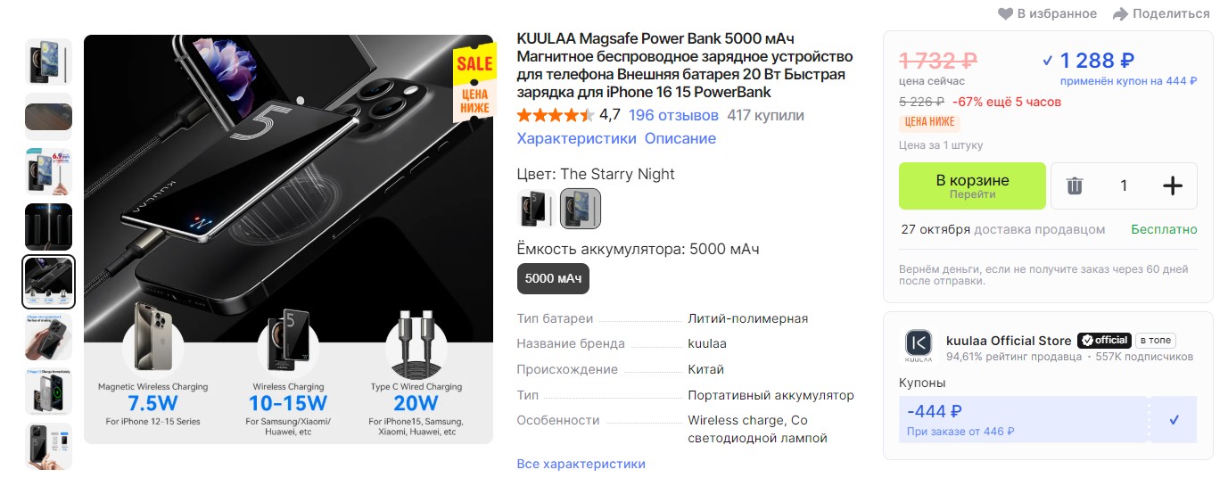 Ёмкость 5000 мАч, мощность беспроводной зарядки 22.5 Вт. Комплектуется кабелем и магнитным кольцом, тонкий корпус 103 мм*68 мм*6,9 мм. Рейтинг высокий, много продаж.