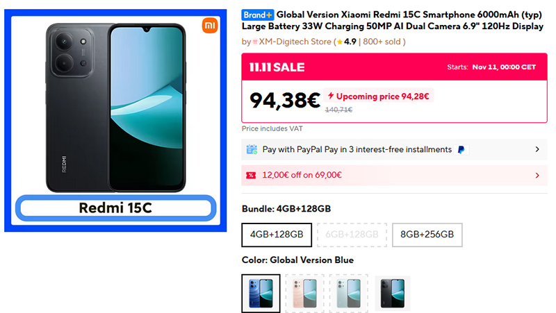 Глобальная версия смартфона Xiaomi Redmi 15C на распродаже будет стоить всего €94. При этом там платформа Mediatek Dimensity 6300 (6 nm), дисплей 6,9" 120 Hz, 4/128 ГБ, камера 50 Мпикс, аккумулятор 6000 мАч со скоростью зарядки 33 Вт. За такие деньги - очень даже неплохо!