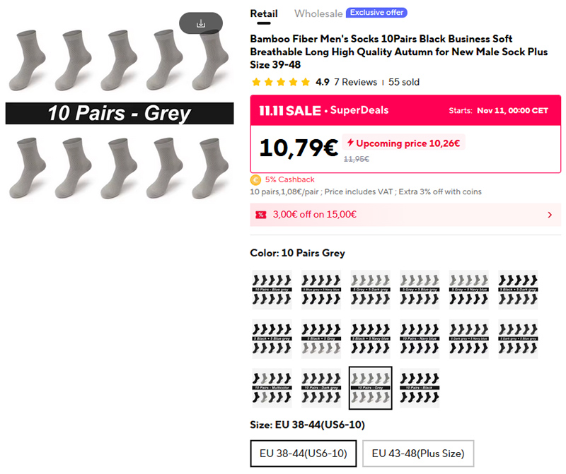 Это не в плане распродажи, а просто пришла пора заказывать новый комплект носков из бамбуковой ткани - вот такие. Хорошее качество, легкие, дышащие, еще и служат довольно долго. Я их много лет там заказываю периодически. 10 пар за 10 евро - вполне нормально. И есть различные варианты цветов.