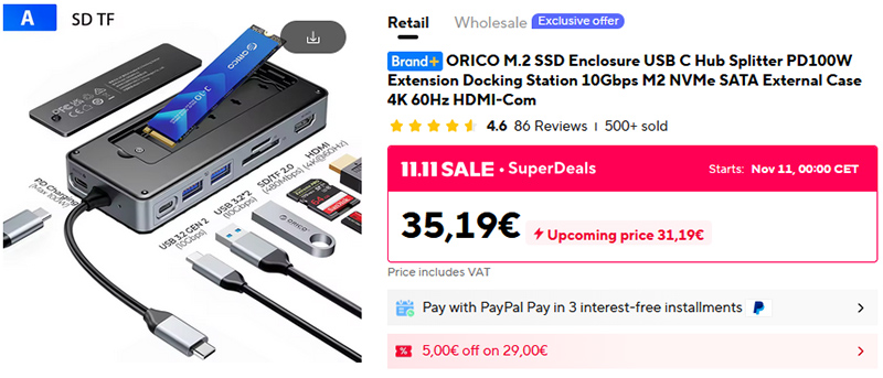 Мощный 11-дюймовый планшет Xiaomi Pad 7 (мой обзор) в стартовой комплектации на распродаже обещают за 242 евро. На Amazon эта комплектация стоит на 50 евро дороже.