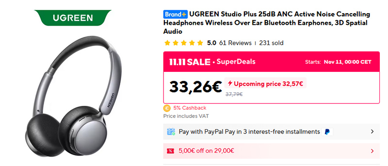 Недорогие накладные наушники UGREEN Studio Plus с активным шумодавом 25дБ. Двойной микрофон с технологией DNN для подавления шума при звонках, Bluetooth 5.0, кодек AAC, время воспроизведения 80 часов прослушивания с выключенной функцией шумоподавления. Управление кнопочное, настраиваются через приложение UGREEN.