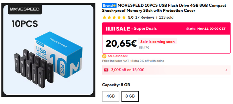 Обычные флешки от Movespeed на 4 или 8 ГБ. Компактные, легкие. И тут фишка в том, что за 20 евро вы их получаете аж 10 штук на 8 ГБ (за 18 - 10 штук на 4 ГБ). Хранить всякие файлы, сканы важных документов и так далее.