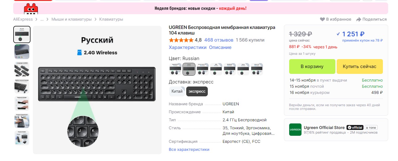 Беспроводная клавиатура Ugreen за 881 рубль на распродаже