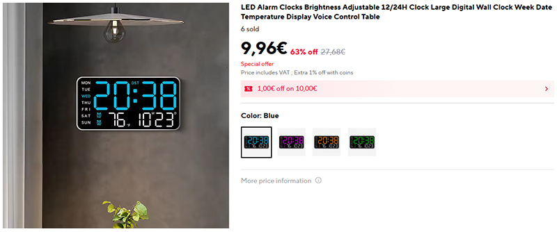 Большие настольные или настенные часы, которые показывают время, дату, день недели и температуру в помещении. Цифры отлично видно даже из другого конца комнаты. Регулируемая яркость, два будильника. Могут работать от батареек ААА, но в этом случае время показывают 10 секунд, а снова включить их можно по хлопку. Если подключены к USB, то время показывают постоянно. Размеры 21.5 x 11 x 2.7 см.