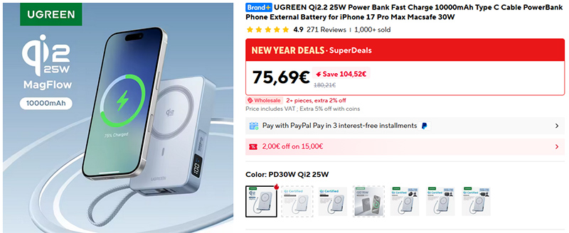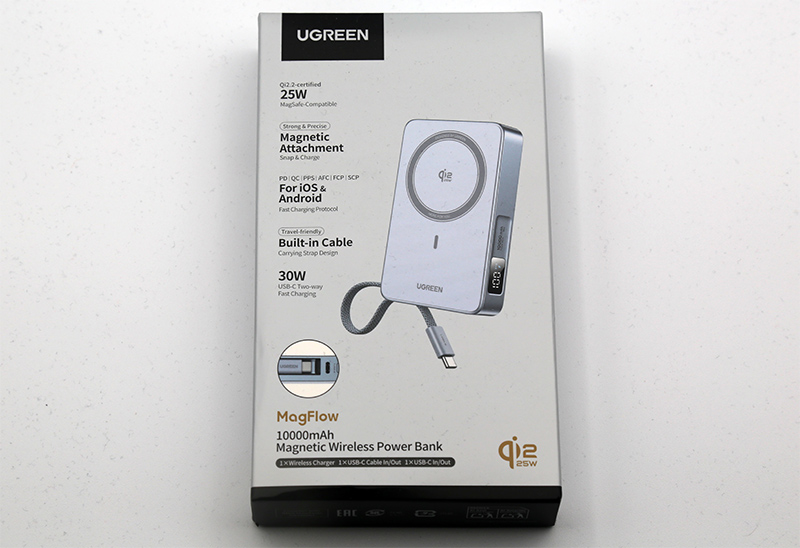 Внешний аккумулятор UGREEN Qi2.2 25W MagFlow 10000 мАч. Собственно, в названии там все сказано. Поддерживает стандарт Qi2.2 - беспроводная зарядка мощностью 25 Вт, поддерживает магнитную беспроводную зарядку MagFlow (MagSafe). Есть встроенный кабель и дисплей, показывающий уровень заряда аккумулятора. Мощность зарядки самого аккумулятора - 30 Вт. Одновременно может заряжать до трех устройств (два по кабелю и одно по беспроводной зарядке).