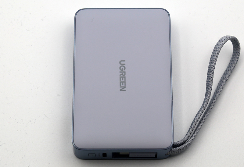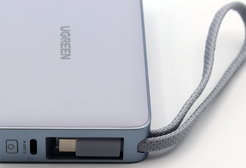 Встроенный кабель - он же петелька для переноски, порт Type-C In/Out, кнопка питания.