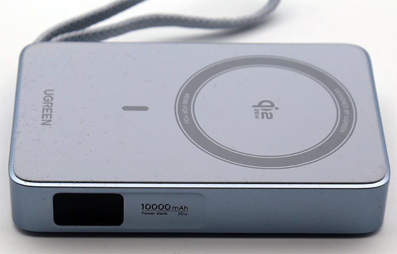 На верхней части - площадка для магнитной беспроводной зарядки Qi2.2, на боковой грани - дисплей, показывающий мощность зарядки.