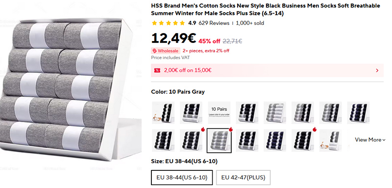 Мужские хлопковые носки известного бренда HSS. Набор из 10 пар за 12 евро. Разные виды цветов, разные комбинации цветов, размеры от 38 до 44.