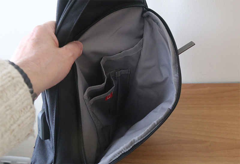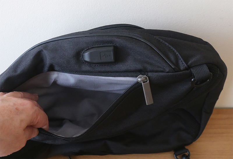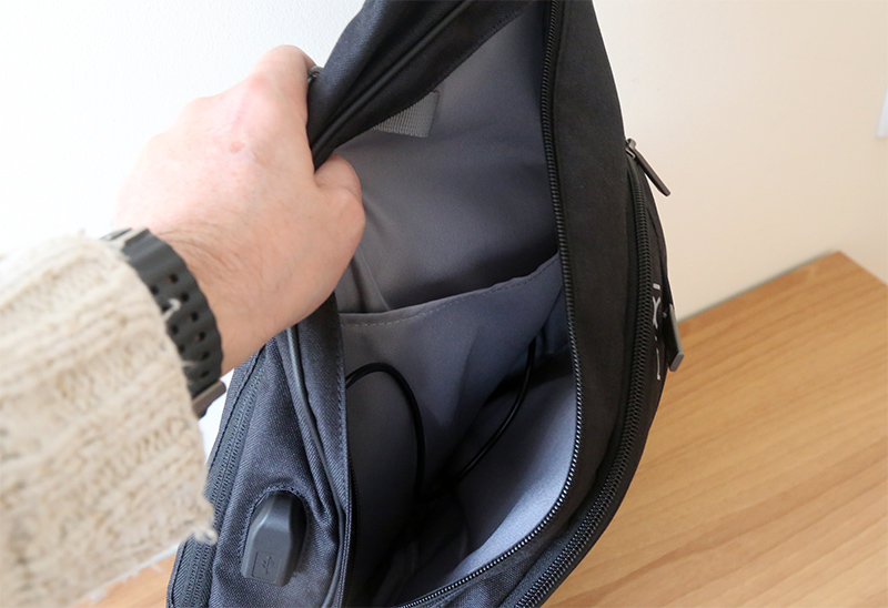 Потайной карман на задней части и порт для зарядки гаджетов.
