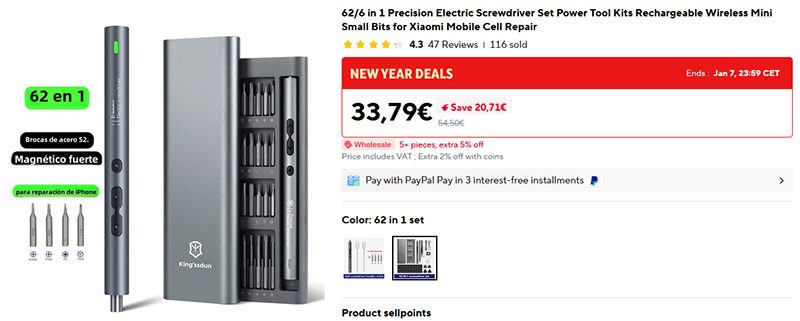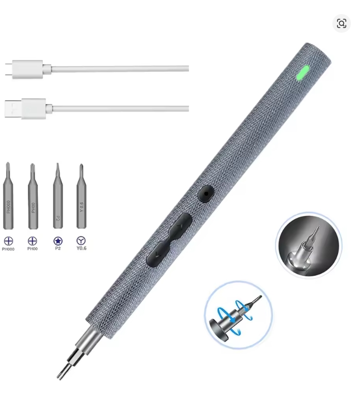 Электрическая отвертка для тонких работ. Высокоскоростной двигатель 200 об/мин для эффективного закручивания винтов, встроенный литий-ионный аккумулятор емкостью 350 мАч (на одной зарядке может закрутить до 400 винтиков). Изготовлена из алюминиевого сплава с анодированным покрытием. В комплект входит чехол и 62 биты. Отличная штука, я такой пользуюсь несколько лет, она меня много раз выручала.