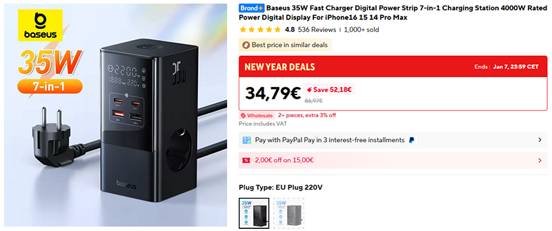 Удлинитель на две евророзетки, он же универсальный зарядный адаптер "7 в 1" мощностью 35 Вт от Baseus. Два быстрых порта Type-C, быстрый порт USB-A (все - по 30 Вт) и USB-A на 5 Вт. Большой дисплей, на который выводится подробная информация о зарядке. Более 1000 продаж, средний рейтинг 4,8.