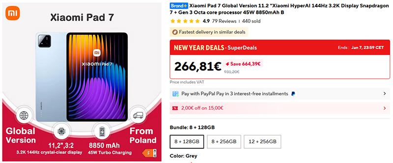 Отличная цена на продвинутый планшет Xiaomi Pad 7делал его обзор, он тогда стоил €364). Цельнометаллический корпус из алюминиевого сплава, отличный экран, мощная платформа, хороший звук встроенных динамиков, хорошая автономность, возможность использования стилуса, который крепится прямо к корпусу, возможность использования фирменного чехла с клавиатурой.