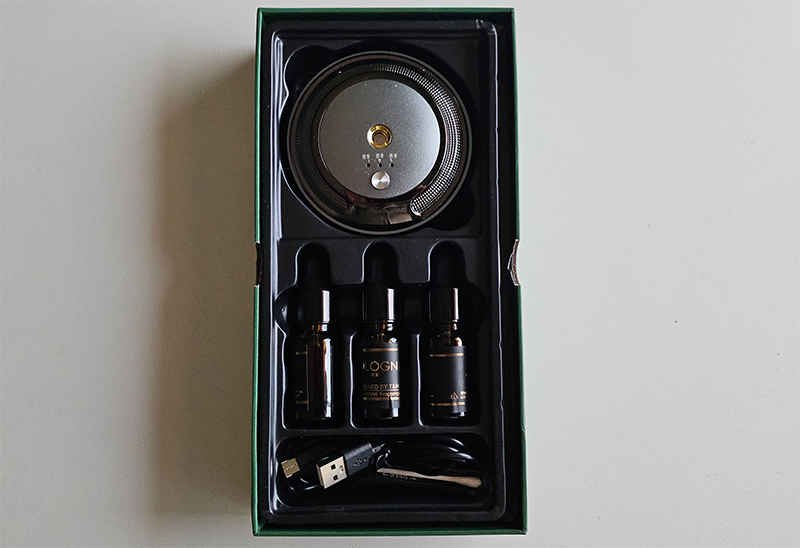 Комплект: сам диффузор, три баночки с маслами, кабель для зарядки.