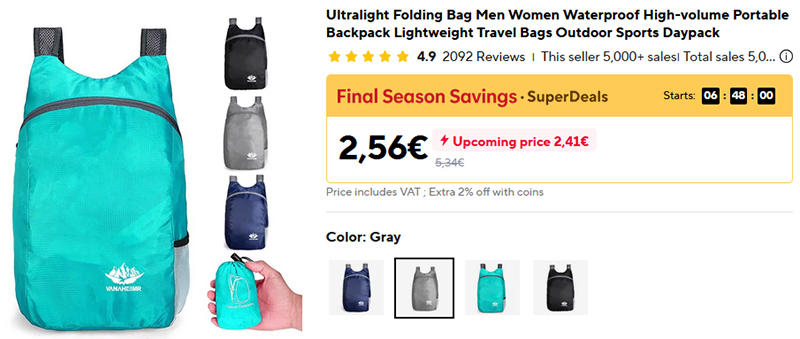 Тонкий и легкий рюкзачок, который в сложенном виде помещается в ладони. Размер рюкзака - 41х30х11 см, в сложенном виде - 12х7 см. В сложенном виде в сумке будет занимать совсем немного места, а как понадобится - развернуть и надеть на спину.