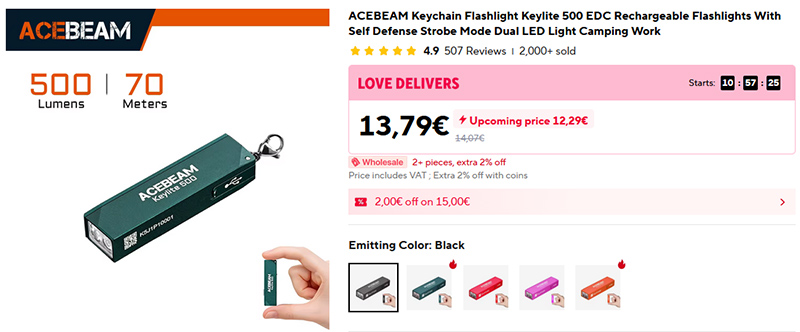 Сверхкомпактный, при этом достаточно яркий фонарик. 500 люмен, бьет на 70 метров, есть индикатор заряда, сам фонарик заряжается через Type-C.