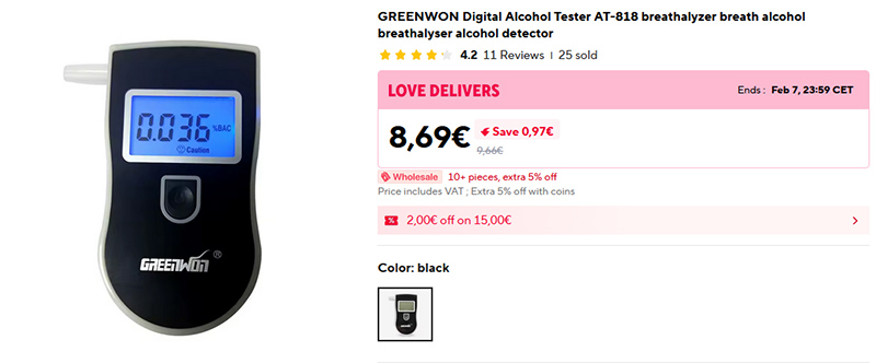 Один из самых популярных бытовых алкотестеров на Aliexpress - Greenwon AT-818, я именно его и использую. Работает от двух батареек AAA, требует 10-секундного прогрева, единицы измерения меняются. У него один-единственный минус: при превышении уровня начинает очень громко и очень противно пищать. Но это легко устраняется (зачем мне звуковой сигнал, если я могу прочитать показания на дисплее): снимается задняя крышка и у динамика отсоединяется проводочек, после чего алкотестер становится немым.