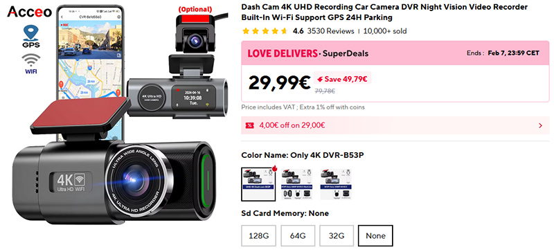Компактный видеорегистратор 4К Acceo. Встроенный GPS, настройка через приложение по WiFi, режим паркинга и так далее. Есть варианты комплектации с задней камерой и круглосуточного мониторинга парковки.