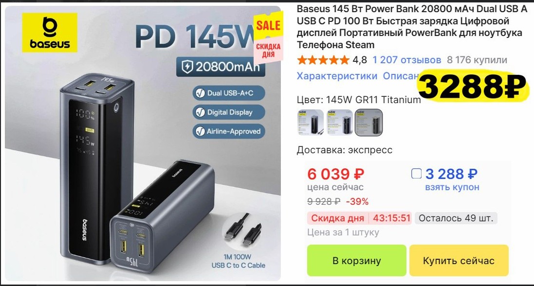 Есть поддержка QC3.0 (18 Ватт) и PD (всего 36 Ватт). Последнее, конечно, маловато. Но для телефонов и планшетов пойдёт. Нет, и ноутбуки заряжаются, но достаточно долго.