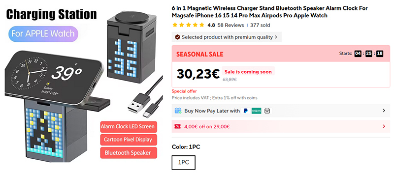 Устройство "6 в 1": беспроводная зарядка для смартфона, одновременно для наушников и часов; дисплей, на который можно выводить различную информацию (например, время); будильник, беспроводная колонка.