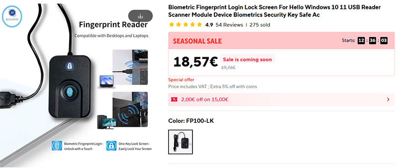 Искал себе биометрический сенсор в виде отдельного устройства с кабелем для Windows Hello (компактный в виде адаптера - не слишком удобный) - больше всего понравился вот такой. И цена у него адекватная, а то попадались устройства и за 40, и даже за 60 с чем-то евро - это уже перебор.