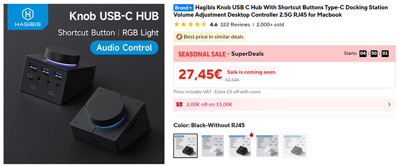 Док-станция Hagabis Knob с кучей функций: регулировка громкости, управление плеером, USB-хаб на несколько портов, подключение микрофона и наушников, кардридер, есть версия с портом Ethernet.