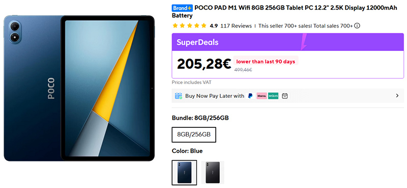 Недорогой планшет POCO Pad M1 с хорошими характеристиками. Дисплей 12,2" 1600 x 2560, Qualcomm Snapdragon 7s Gen 4, 8/256 GB, microSD, стереодинамики, Wi-Fi6, аккумулятор 12000 мАч, мощность зарядки 33 Вт.