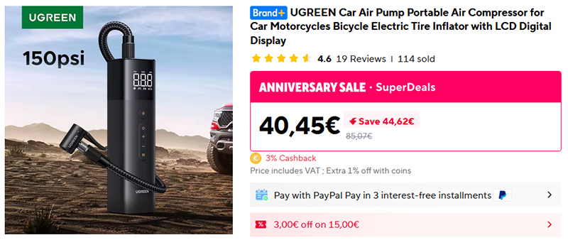 Портативный беспроводной автомобильный насос UGREEN. От одного заряда может полностью накачать спущенное автомобильное колеса, подходит для мотоциклов, велосипедов и мячей. В комплекте идут соответствующие переходники. Есть дисплей, можно выставлять желаемое давление для накачки.