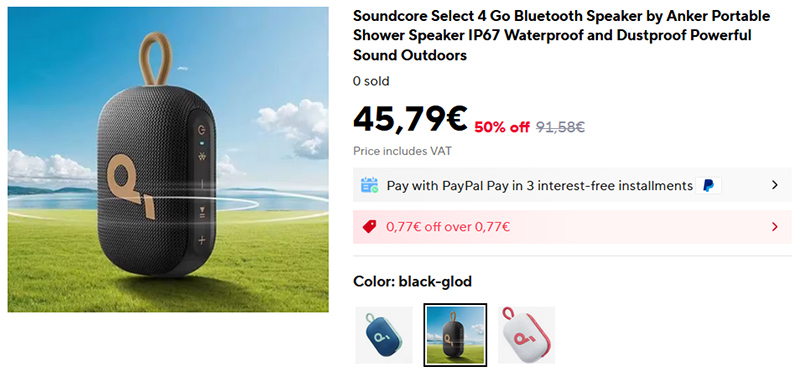 Портативная, но достаточно мощная беспроводная влагозащищенная колонка Soundcore Select 4 Go. До 20 часов непрерывного прослушивания музыки без подзарядки, выходная мощность 5 Вт, чистое и динамичное звучание, легкий вес и ремешок для переноски, поддержка стереопары со второй такой же колонкой.
