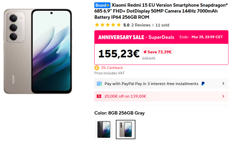 Хорошая цена на бюджетный смартфон Xiaomi Redmi 15 (на европейском Amazon он на 40 евро дороже). Qualcomm Snapdragon 6s Gen 3; дисплей 6,9", IPS, 144 Гц, 850 нит, Corning Gorilla Glass 3; памяти 8/256 GB; камера 50 Мпикс PDAF; аккумулятор 7000 мАч, зарядка 33 Вт.