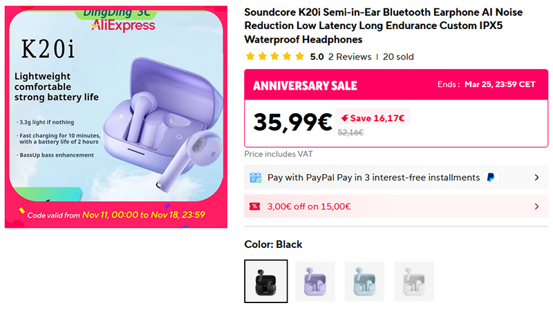 Недорогие беспроводные наушники-вкладыши Soundcore K20i. Каждый наушник весит всего 3 грамма, до 6 часов работы от одной зарядки, до 36 часов с подзарядкой из кейса, поддерживает настройку через приложение.