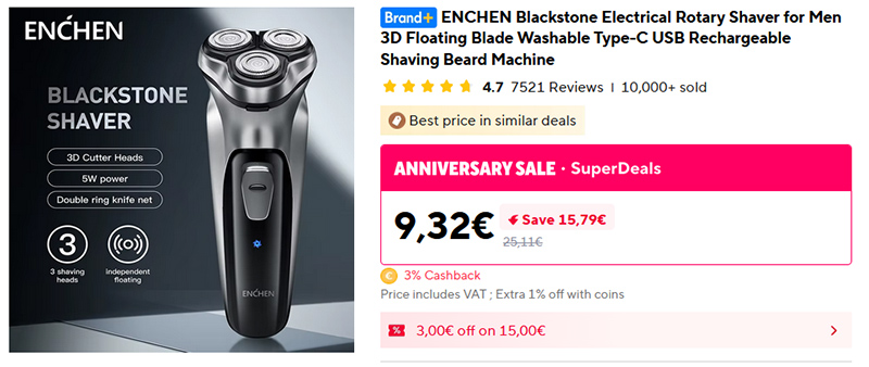 Дешевая, но при этом вполне пристойная роторная электробритва ENCHEN Blackstone Shaver для сухого бритья. Независимые плавающие режущие головки, лезвия сетки имеют конструкцию с двойной петлей, что удваивает эффективность бритья, от одной зарядки работает до 2 месяцев. Более 10 тысяч продаж, средняя оценка 4,7.