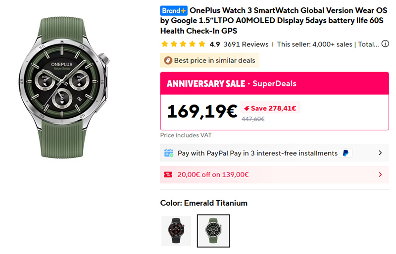 Хорошая цена на умные часы OnePlus Watch 3 (на Amazon они - 232 евро). Я делал их обзор, часы, в общем, очень понравились. Они на Wear OS (ими можно платить в ЕС, можно выводить карту с маршрутом карт Google прямо на экран), при этом на полной загрузке и с AOD у них автономность - четыре дня (у всех остальных часов на Wear OS - не больше двух суток). Моему сыну они очень понравились, он после обзора их себе забрал и теперь практически не снимает. Рекомендую, кстати, брать именно ту модель, которая на скриншоте - серебристый корпус и зеленый ремешок. Она выглядит заметно эффектнее, чем черный вариант.