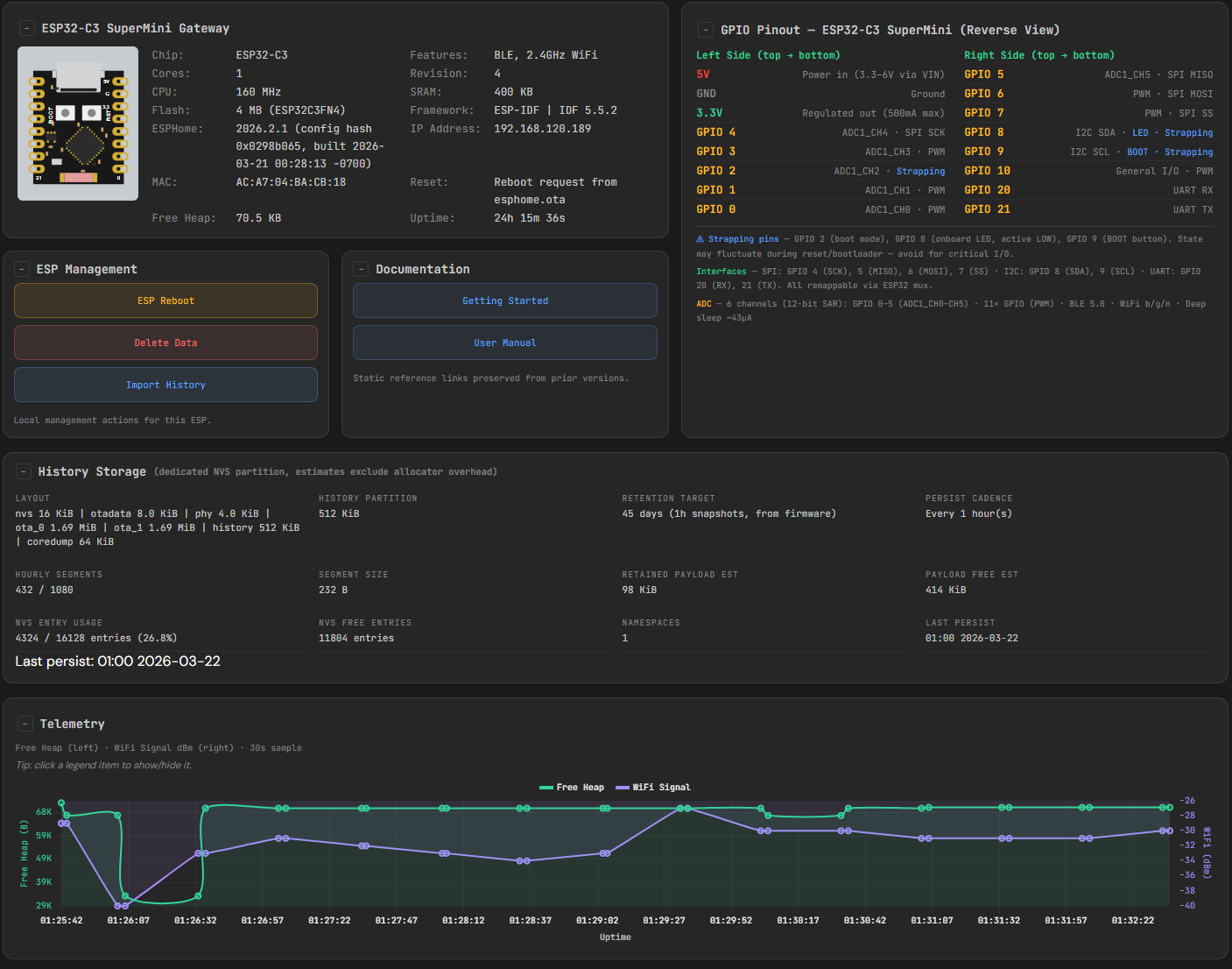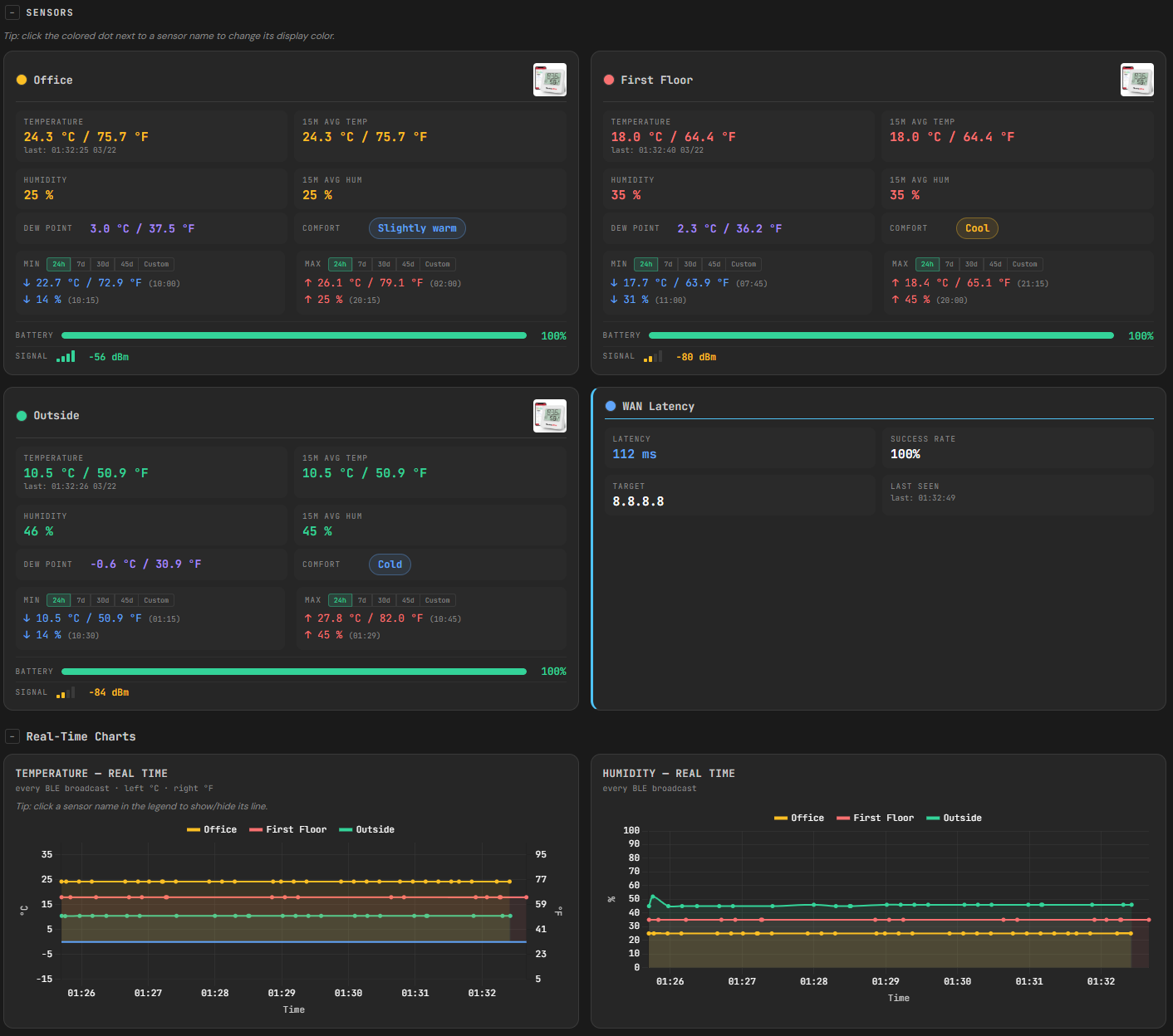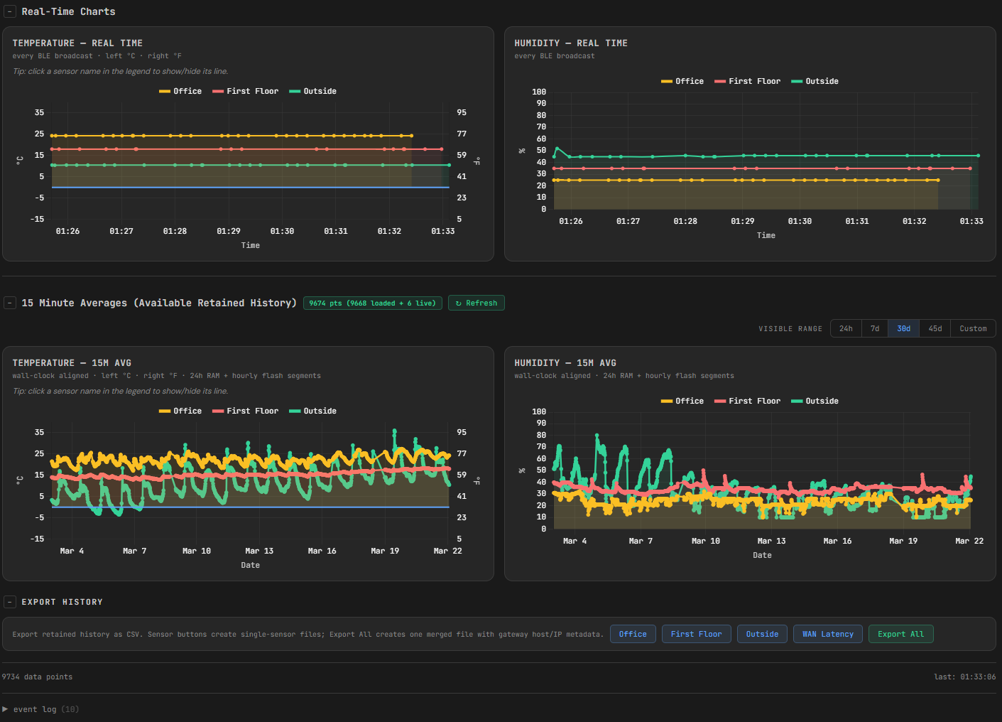 А вот и проект - оно началось как простой шлюз чтобы можно было посмотреть темп-влажность ThermoPro BLE датчиков. Из этого вышла вторая и третья версия которая сейчас в переработке (поэтому и не выставляю github repo) в качестве модульной архитектуры - оно будет поддерживать не только датчики темп/влажности, но и другие - weather stations, датчики утечки воды, открывания/закрывания дверей/окон и другие типа метрики - обьем памяти/дисков и динамика, network latency, etc, etc. Данные хранятся в памяти и на флешке, можно хранить данные от 30-ти до 90 дней (в зависимости от размера флешки), можно смотреть все это на dashboard (см скриншоты), можно импортировать и экспортировать данные, можно поставить уведомления через телеграм или mobile push если какой-нибудь threshold будет превышено, можно собрать данные из нескольких шлюзов в один агрегатор через REST API и пр.