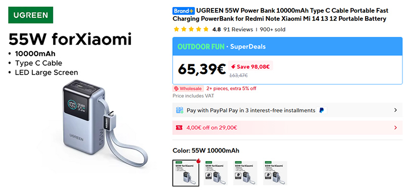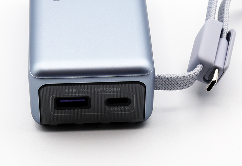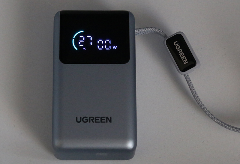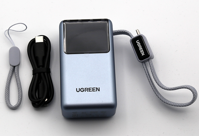 Компактный внешний аккумулятор UGREEN емкостью 10000 мАч и мощностью 55 Вт. Встроенный кабель Type-C, еще два порта - Type-C и USB-A.