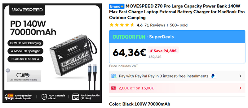 Внешний аккумулятор со впечатляющей емкостью - MOVESPEED Z70. 70000 мАч, суммарная мощность 140 Вт, поддержка PD 100 Вт - эта штука может пару раз полностью зарядить ноутбук с емким аккумулятором, также зарядит и кучу других устройств. Три порта Type-C, два порта USB-A. Сам аккумулятор заряжается на мощности 100 Вт. У него есть встроенный фонарик с тремя режимами работы и режим SOS.