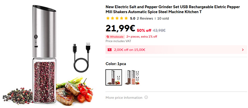 Пришла пора менять мою электрическую мельничку для соли: предыдущая продержалась полтора года, и у нее деградировал аккумулятор - надоело ее заряжать каждую неделю. Но при ее стоимость в 22 евро менять раз в полтора года - не проблема. У меня были разные мельнички, эту модель я считаю оптимальной. Из нее ничего не сыплется (чтобы посолить - ее надо перевернуть), активируется она кнопкой, заряжается через порт Type-C, стеклянная емкость легко откручивается и наполняется заново. Перец я сейчас использую просто черный молотый, а для соли использую такую мельничку - туда засыпаю крупную морскую соль и выставил помол достаточно крупный.