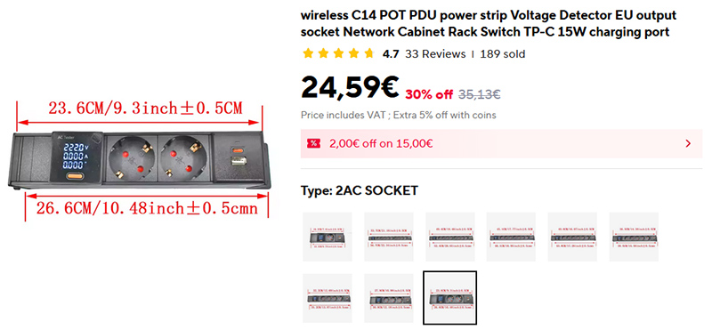 Большой выбор удлинителей с двумя USB-портами для зарядки, евророзетками от 1 до аж 9 и дисплеем, который показывает напряжение, ток, мощность и сколько киловатт уже накрутило. Удлинитель подключается кабелем C14 - как у компьютерных блоков питания.