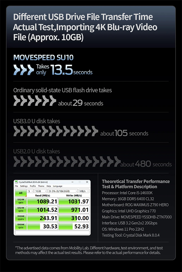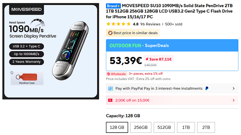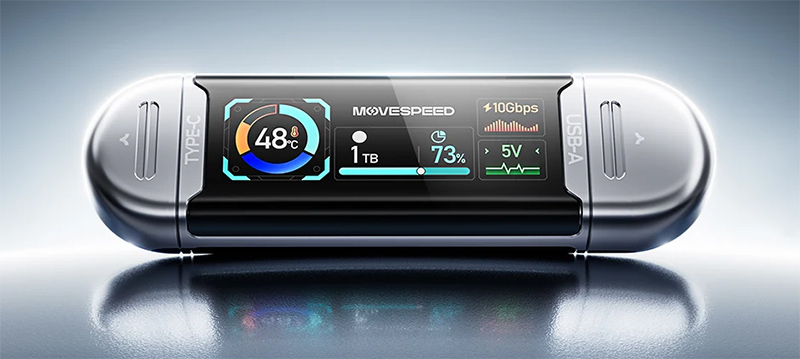 Сверхбыстрая флешка со скоростями до гигабайта в секунду - MOVESPEED S10 с интерфейсом USB 3.2. Удовольствие, конечно, недешевое, но если нужно, чтобы с флешки можно было воспроизводить, например, видео 4К с высокой частотой кадров (до 120fps), то оно того стоит. Флешка поддерживает порты Type-C и USB-A, имеет большой дисплей, на который выводится разнообразная информация о скорости копирования, температуры и так далее.
