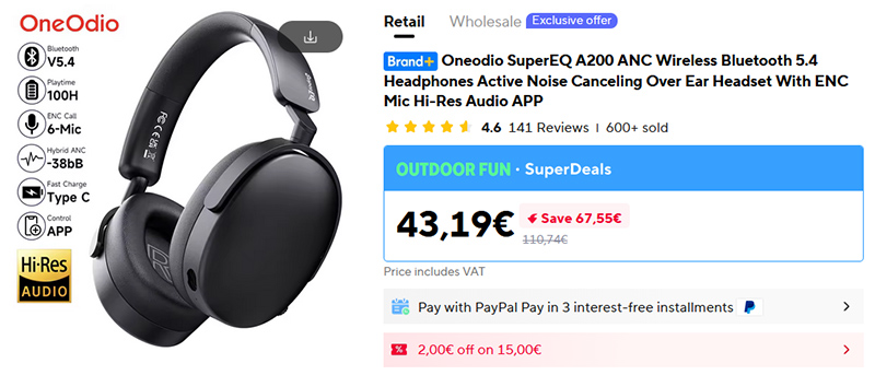 Понизилась цена на отличные полноформатные наушники с активным шумодавом и выносным микрофоном Oneodio SuperEQ A200. У шумодава есть режим прозрачности, также наушники поддерживаются мультипоинт. Я делал их обзор, наушники понравились.