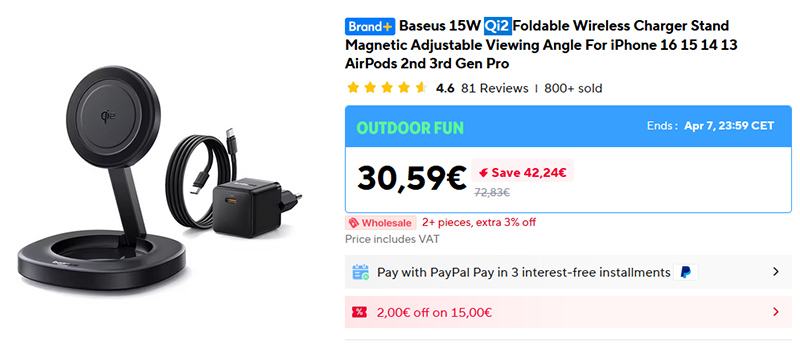 Удобная магнитная подставка, она же беспроводная зарядка от Baseus, поддерживающая стандарт Qi2 с максимальной мощностью зарядки 15 Вт. Имеет несколько степеней свободы для настройки положения смартфона в пространстве, также может складываться. Удобная штука, я примерно такую и использую - для ежедневной зарядки и для видеозвонков по смартфону.