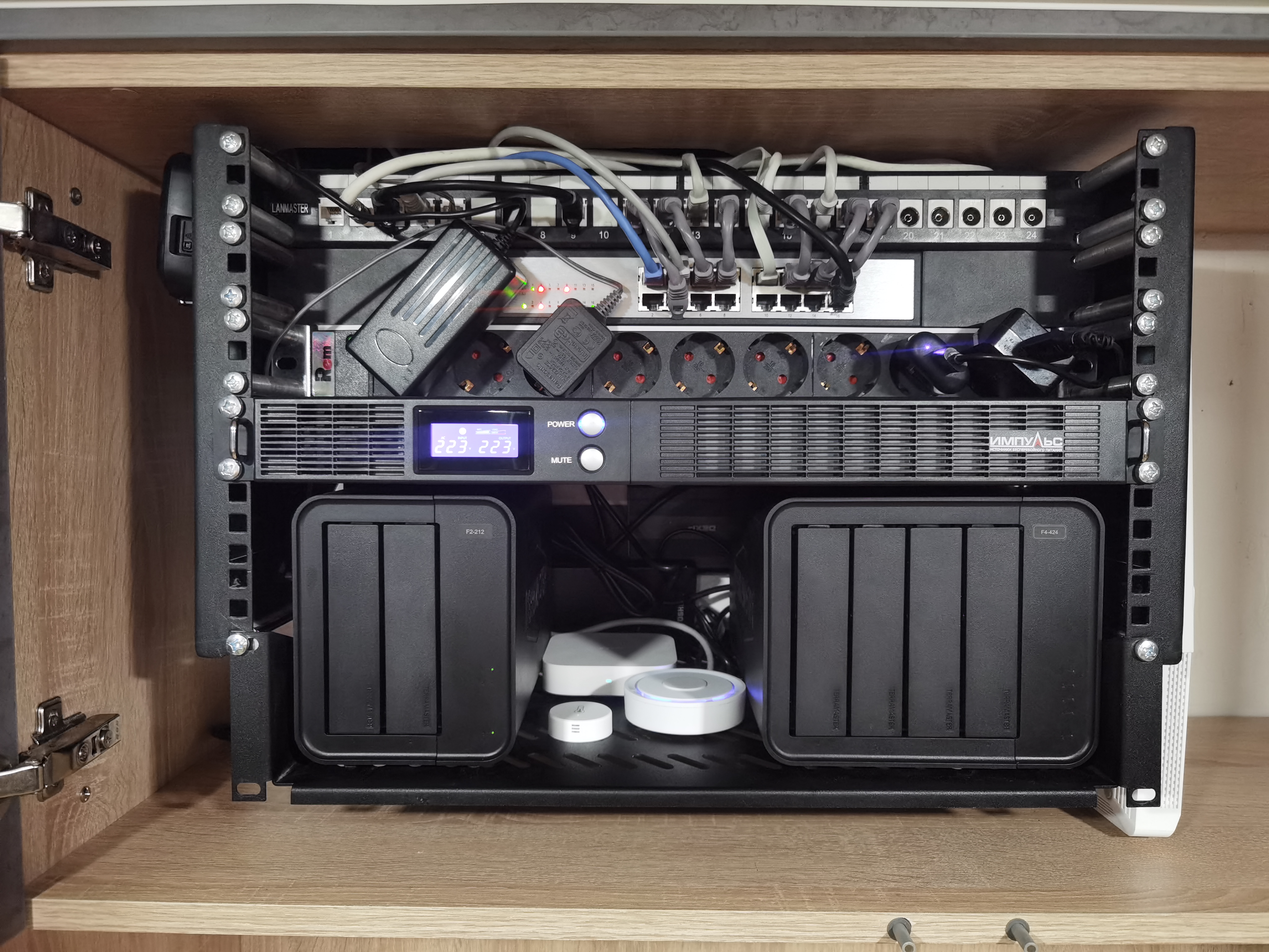 Спасибо конечно большое, но это вынужденное решение. Задача была уместить всё в шкаф глубиной 310 мм. Соответственно, кронштейн на 300 мм и именно поэтому нужен был ИБП глубиной не более 270 мм. А блоки питания и патчкорды мешали закрываться дверцам, т.к. выпирают вперёд за габарит кронштейна. Углубление оборудования выполнено при помощи обычных алюминиевых втулок (гильз) длиной 50 мм из электромагазина и более длинных, чем стандартные, болтов М6.