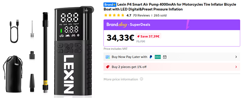 Беспроводной насос Lexin P4 Smart Air Pump для автомобиля, мотоцикла, велосипеда, мячей и надувных матрацев. Встроенный аккумулятор 4000 мАч, обещают, что от одного заряда можно накачать десяток автомобильных колес или 20 мотоциклетных колес. Пять предустановленных режимов, дисплей с информацией, подсветка. Ну и заодно еще может подзаряжать другие устройства. У моего насоса, судя по всему, деградировал аккумулятор, после накачки одного велосипедного колеса уже разряжается - заказал этот, проверю его в деле. Отзывы на него хорошие.