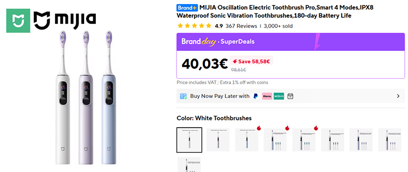 Электрические зубные щетки от дочки Xiaomi - Mijia. Четырехзонный режим, напоминание о пропущенных участках, разные режимы очистки, защита от избыточного давления на десны, водонепроницаемость, интеллектуальный дисплей, на котором отображается продолжительность чистки, очищенные зоны и оставшийся заряд батареи. Заряжаются через порт Type-C, одной зарядки хватает до полугода. Разные цвета, есть комплектации с тремя запасными насадками. Более 3000 продаж, средний рейтинг 4,9.
