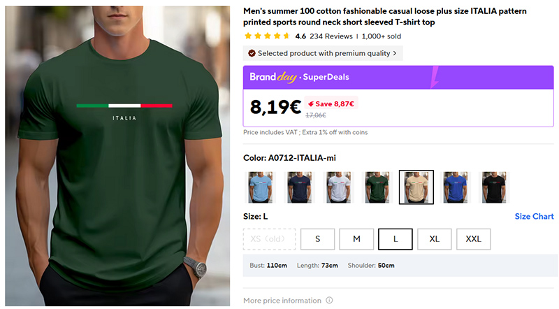 Мужские майки очень хорошего качества, прям рекомендую. Чистый хлопок, очень приятные на ощупь, европейские размеры - я взял себе L, оказалось то что нужно. За 8 евро - вполне хорошо. Взял себе два варианта цветов (мне еще нравится, что есть небольшой принт с цветами итальянского флага и надписью Italia), закажу еще пару.