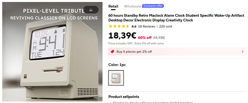 Для фанатов Apple - часы/будильник в виде винтажного Macintosh. Насколько я понимаю, здесь имитируется самая первая модель - Macintosh 128K, выпущенный 24 января 1984 года.